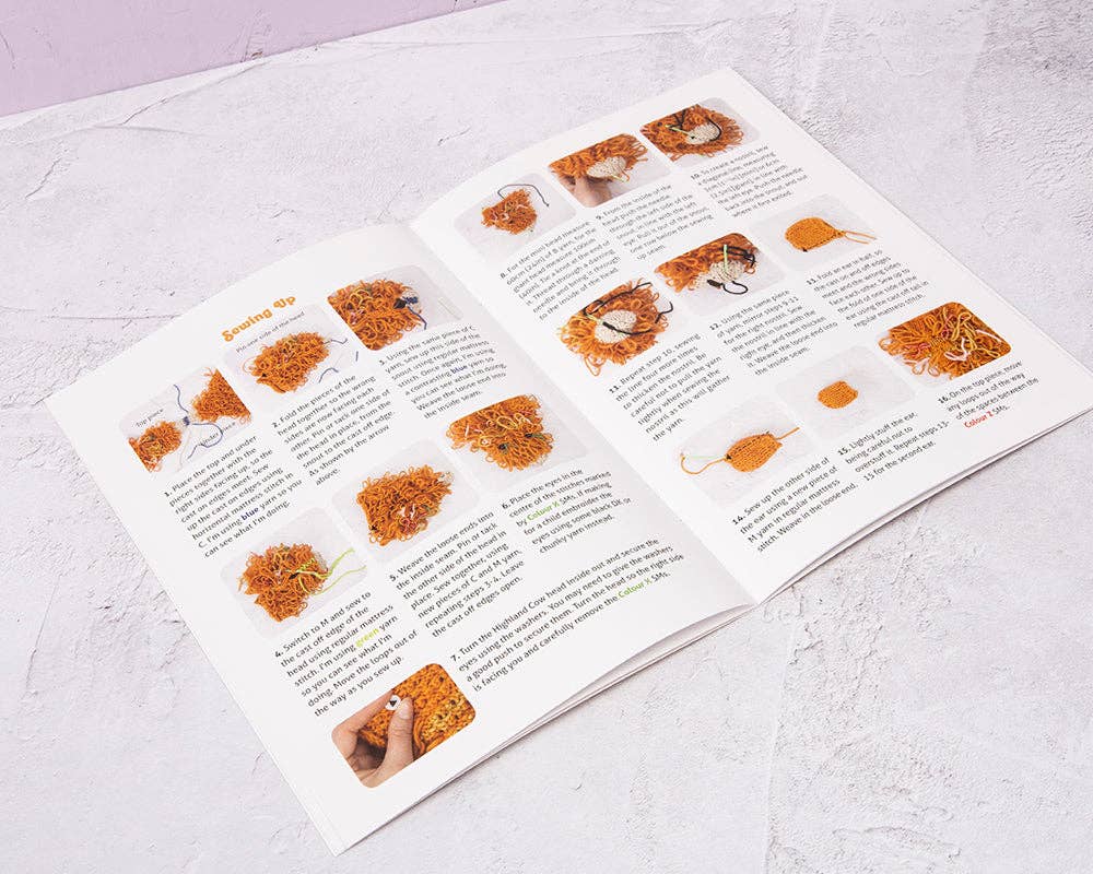 - WHAT'S IN THE KIT? A step by step pattern and photo sewing up booklet - written in English. Main Colour - 2.5 x 100g Stylecraft Special XL Tweed Super Chunky yarn (100% acrylic) Horn Colour - 50g x Stylecraft Special XL Tweed Super Chunky yarn (100% acrylic) Hair Colour - 30g x Stylecraft Special XL Tweed Super Chunky yarn (100% acrylic) A small amount of black super chunky yarn for embroidering the nostrils A pair of 9mm (US 13) knitting needles (optional) Large Sincerely Louise backing board Darning needle 200g toy stuffing 2 x 24mm toy eyes and washers Project bag