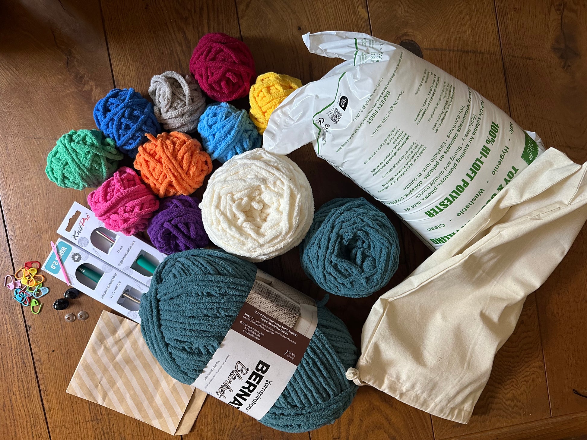 Kit contents: Bernat Blanket Super Chunky Yarn, 2 crochet hooks (7mm and 8mm), a pair of black safety eyes, recycled polyester stuffing, stitch markers, wool needle and a handy project bag.